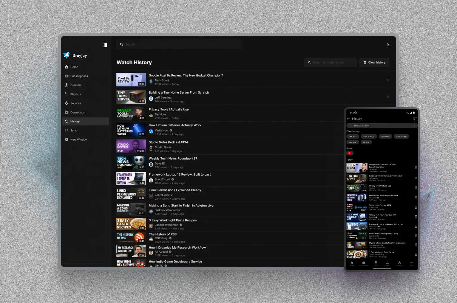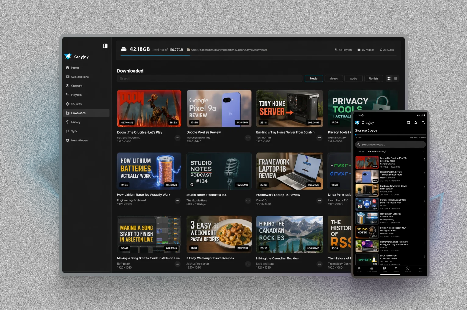 Grayjay stores your subscriptions, watch history, playlists, downloads, and settings locally on your device. Not on our servers.