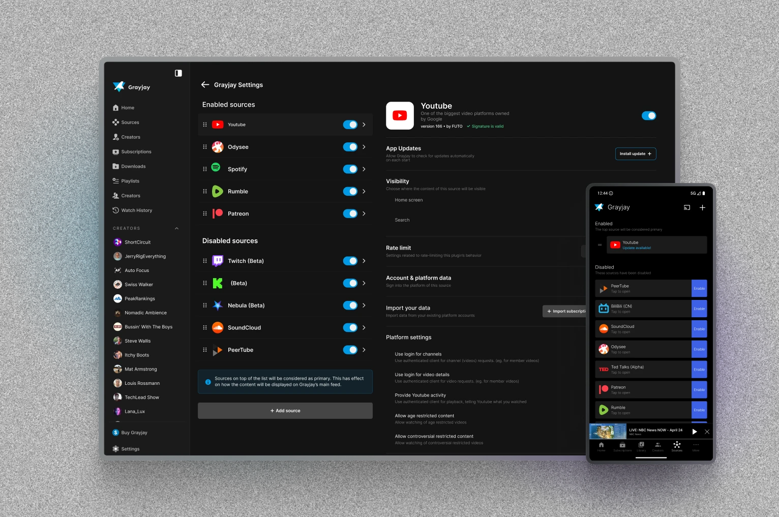 Sources are plugins that connect Grayjay to video platforms. Each supported platform — YouTube, Twitch, Rumble, Odysee, Patreon, Nebula, Kick, PeerTube, SoundCloud, Bilibili, and more — has its own plugin. You enable the ones you want, and Grayjay aggregates content from all of them.