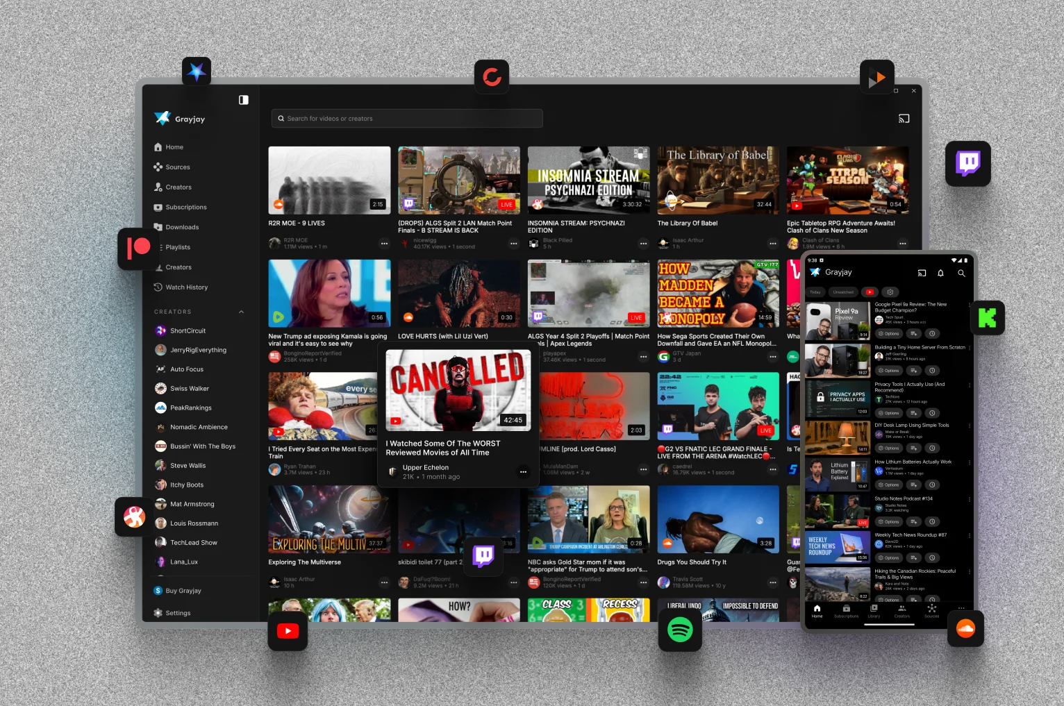 Grayjay pulls your subscriptions from multiple platforms into one feed. No algorithms. No account required.